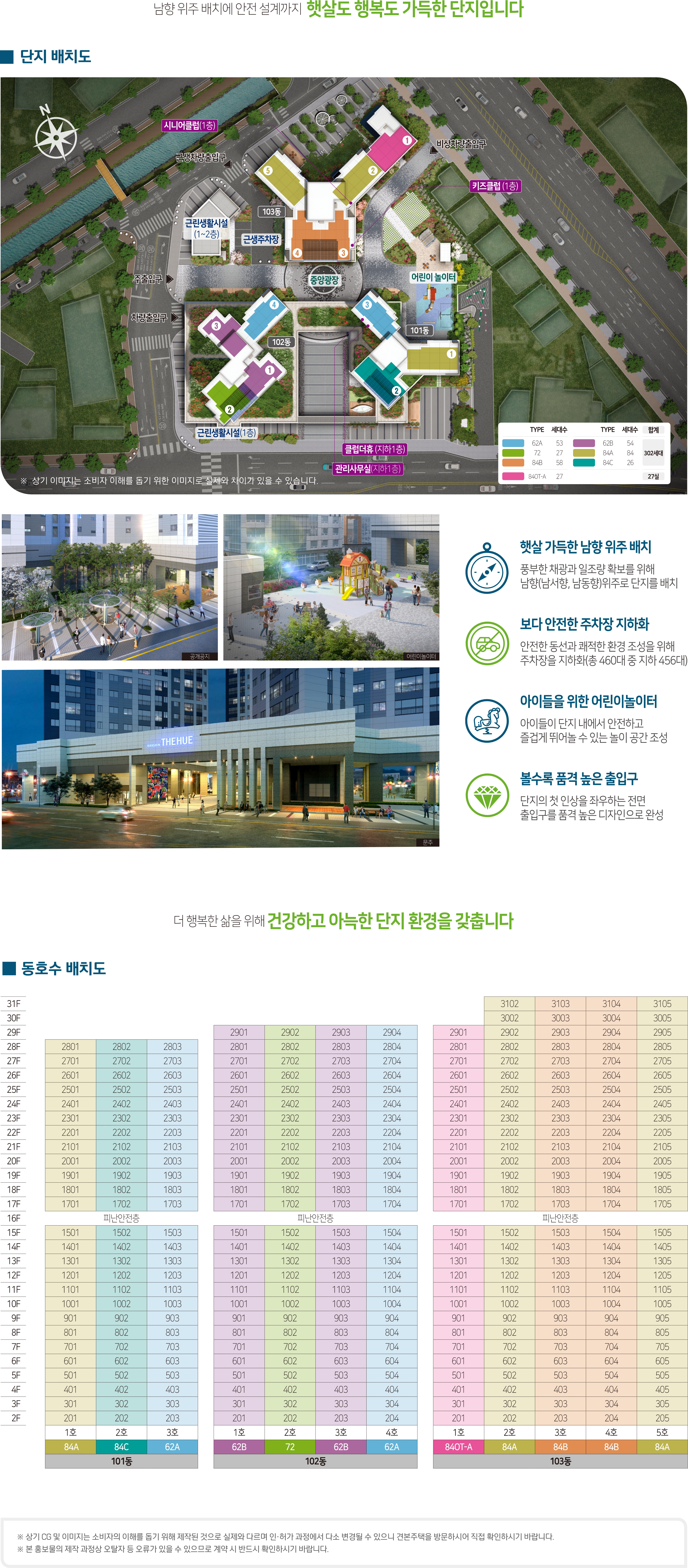 | 세대수 | 총329세대 - 아파트 302세대 (전용면적 62㎡A/B, 72㎡ , 84㎡ A/B/C), 오피스텔84 27실 |