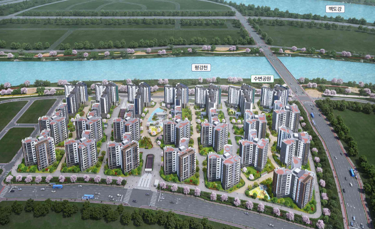 평강천 수변 조망: 단지 바로 옆에 평강천이 흐르고 있어 일부 세대에서는 영구적인 수변 조망이 가능하며, 수변공원을 집 앞 정원처럼 이용할 수 있는 '워터프론트' 입지를 자랑합니다.
